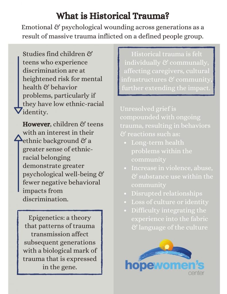Historical trauma is not often discussed, and therefore, not easily understood – especially if it has not been personally experienced. This fact sheet explains basic ‘need to know’ information about historical trauma and its effects. We encourage you to learn and study more on this important topic!